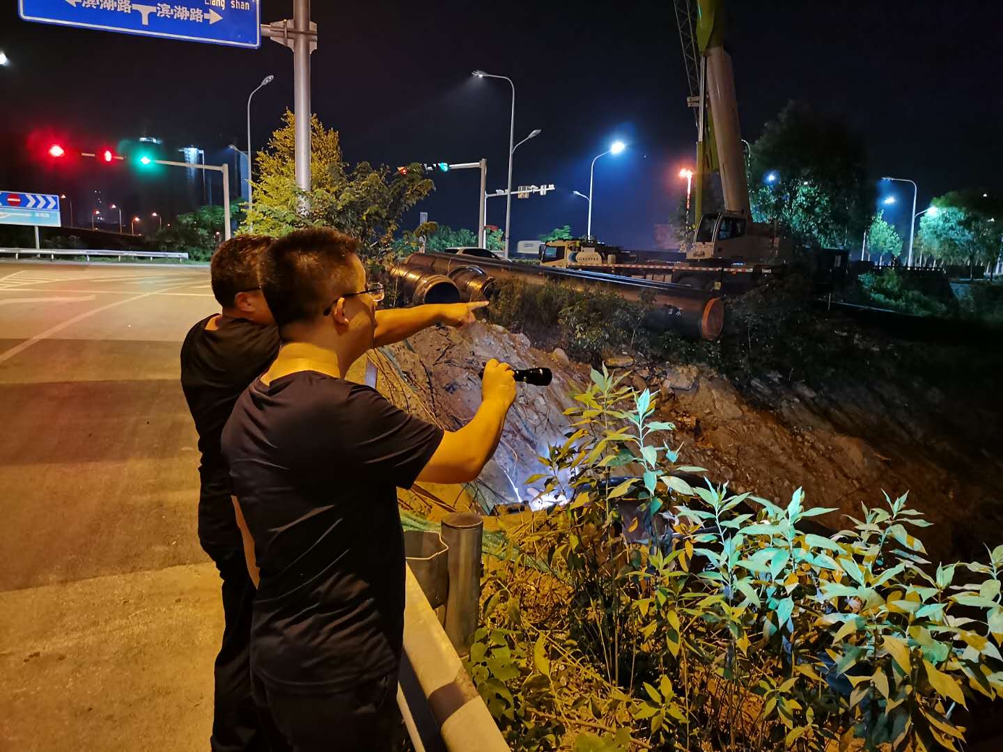 鄧剛先后視察了管網(wǎng)施工第六標(biāo)段、頂管過地表水超采、頂管過火頭灣大橋、頂管過S321公路等5處頂管施工現(xiàn)場(chǎng)。時(shí)至23:40分,在頂管過南躍進(jìn)溝工作井施工現(xiàn)場(chǎng),數(shù)名施工人員挑燈夜戰(zhàn),正進(jìn)行頂管軌道焊接安裝和設(shè)備調(diào)試工作,夜燈下的身影在工地上來往奔波,現(xiàn)場(chǎng)到處是搶抓工期的干勁與熱情。