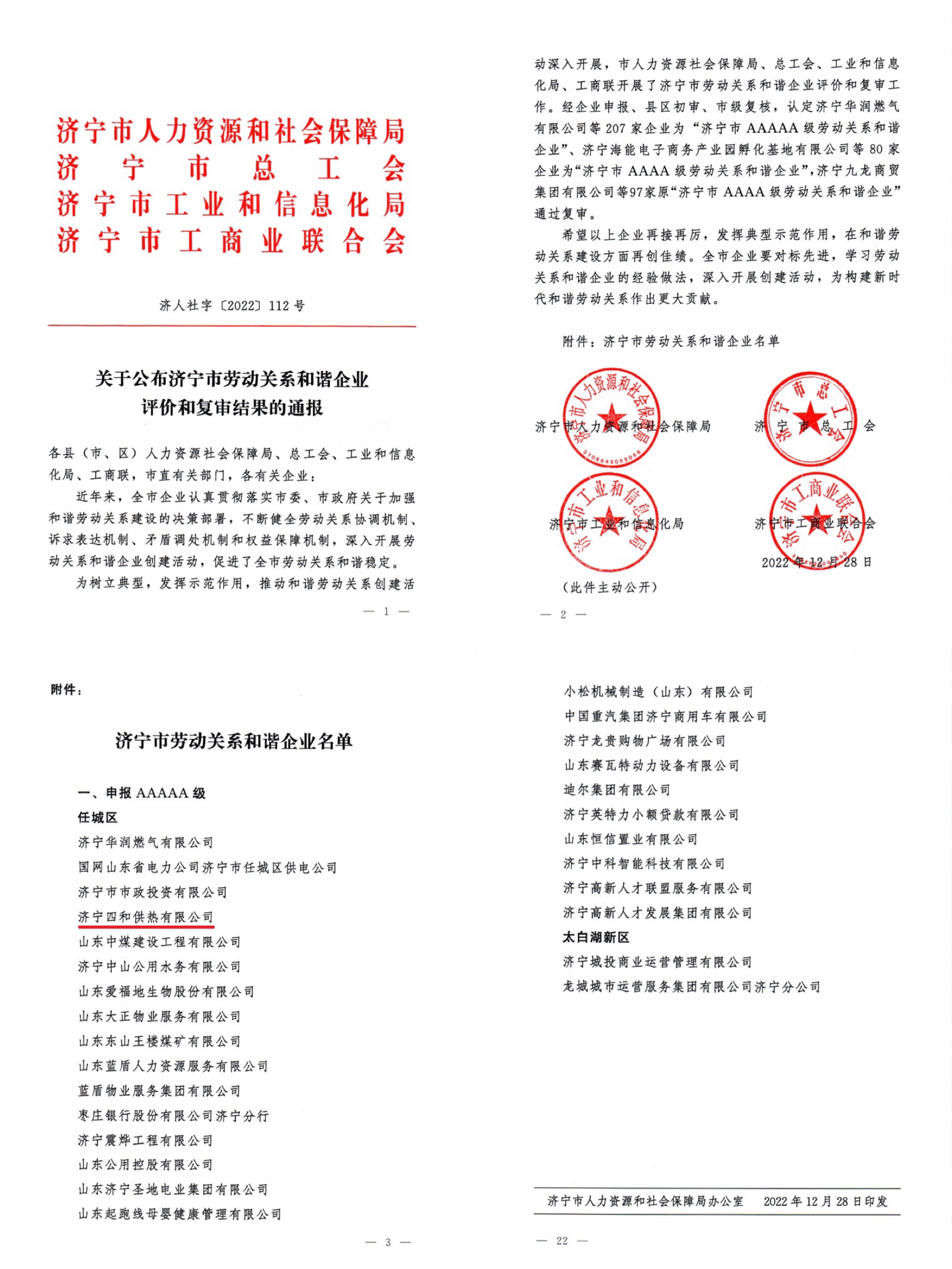 濟(jì)寧四和供熱有限公司 榮獲“AAAAA級勞動關(guān)系和諧企業(yè)”稱號